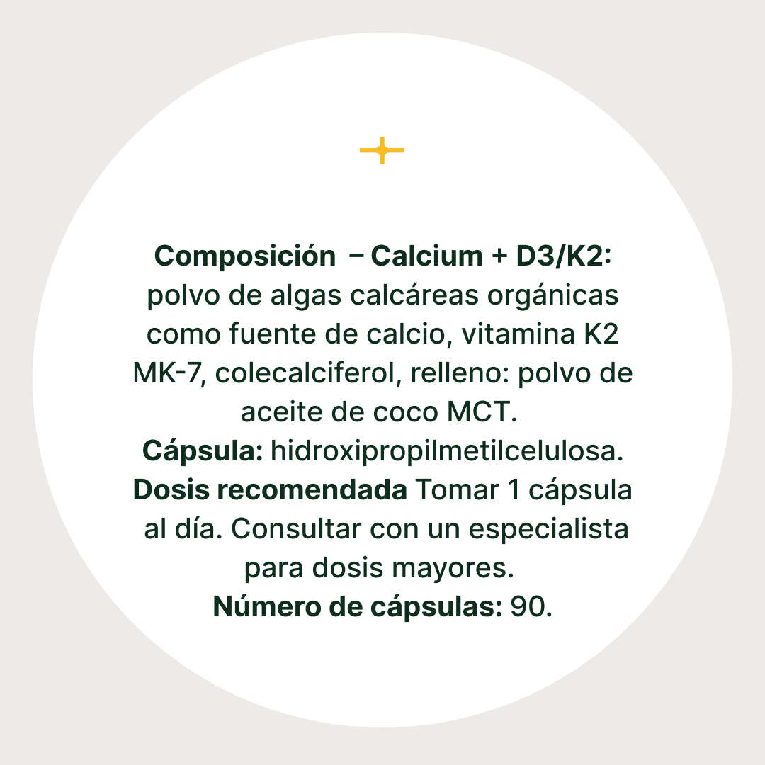 - 338,5 mg de calcio y 400 UI de D3 + 25 mcg de K2 en 1 cápsula.