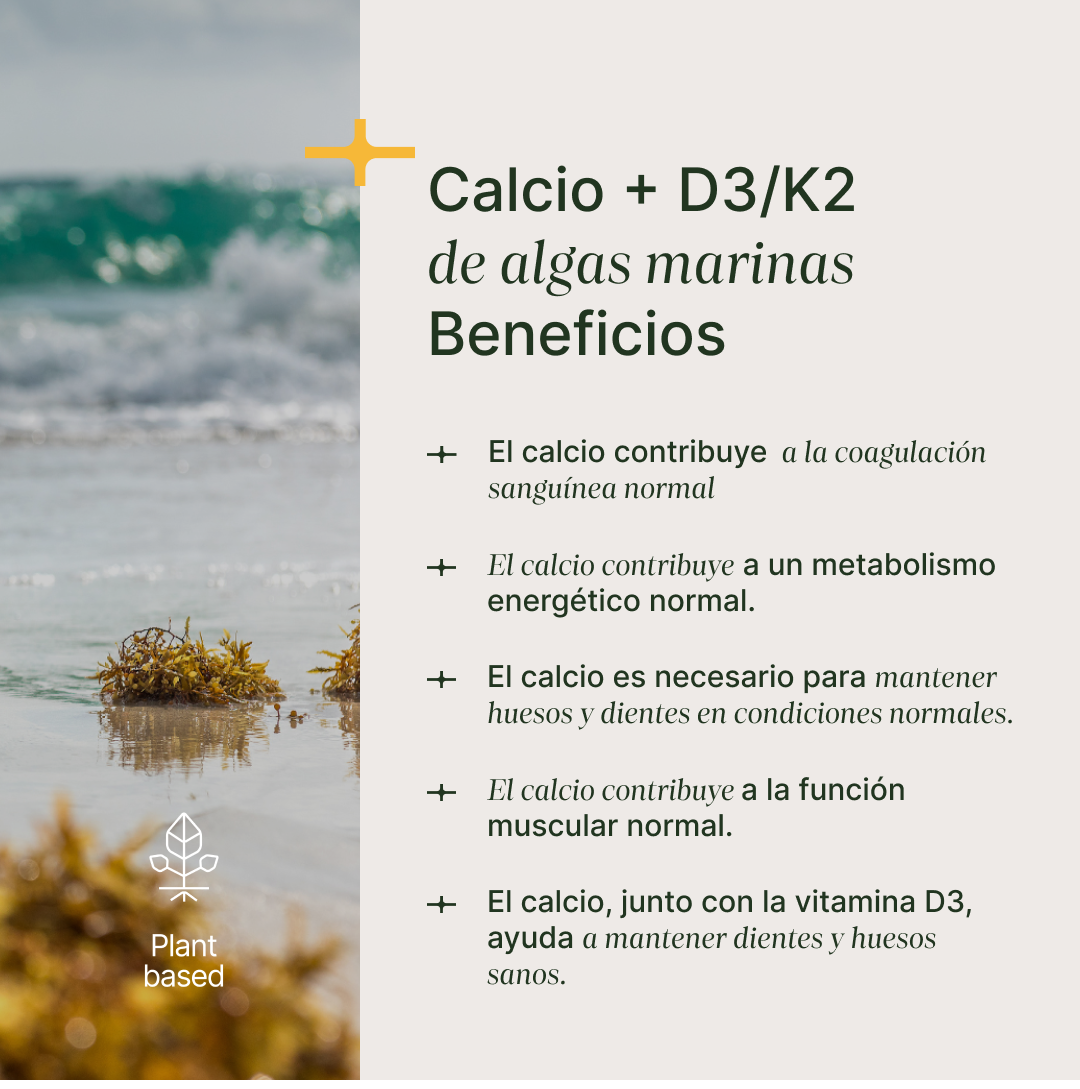 - Vitamina D3 de origen vegetal extraída de algas marinas, crucial para la absorción de calcio en el intestino.