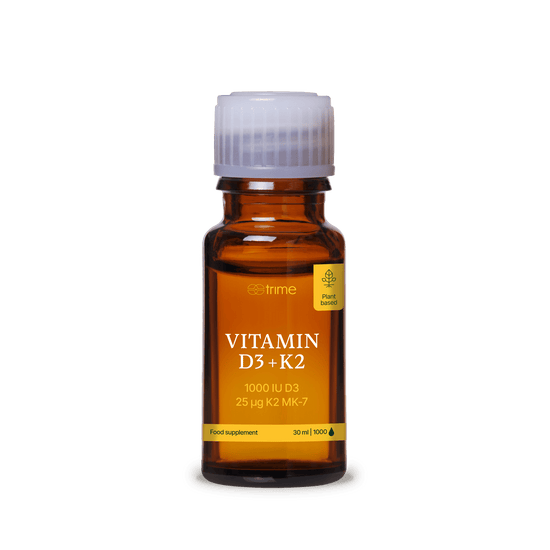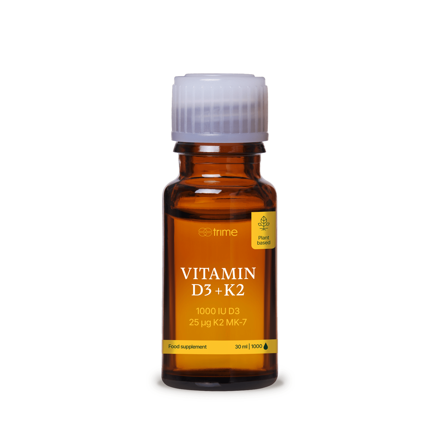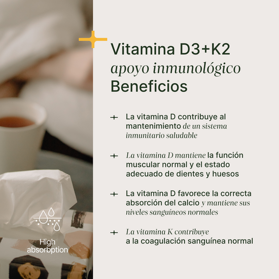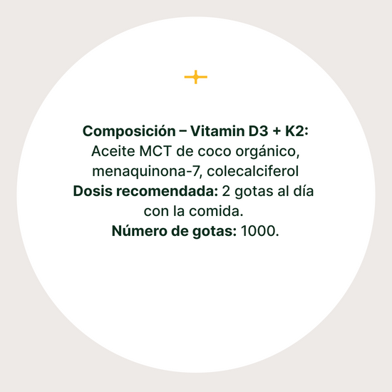 Mezcla sinérgica de vitaminas D3 y K2. Las dos vitaminas esenciales provienen de fuentes vegetales naturales, combinadas con aceite MCT de coco orgánico. Las vitaminas D3 y K2 son dos de los nutrientes más deficientes, y son fundamentales no solo para el buen funcionamiento del sistema inmunitario, sino también para la salud ósea, cardiovascular y muscular.