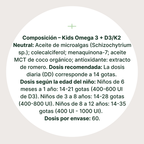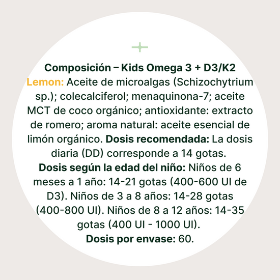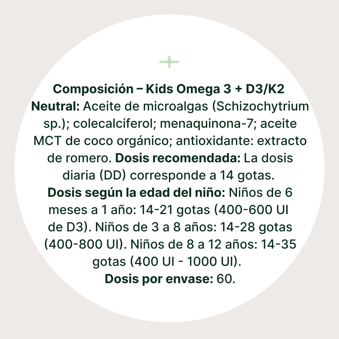 Fórmula única que contiene los nutrientes más deficientes: omega-3 (DHA, EPA) y vitaminas D3 y K2, esenciales para el desarrollo saludable de los niños. Procedente exclusivamente de fuentes vegetales naturales.