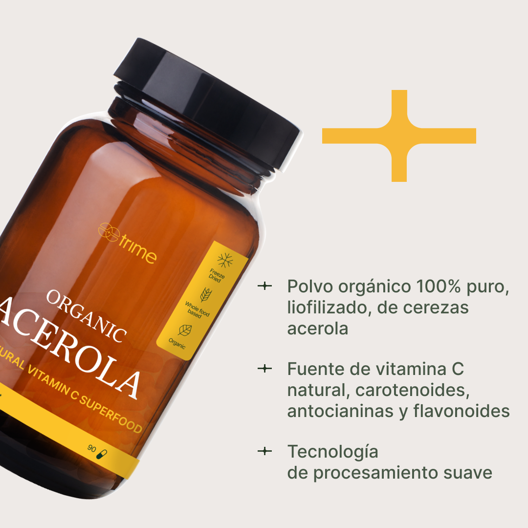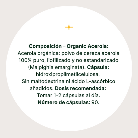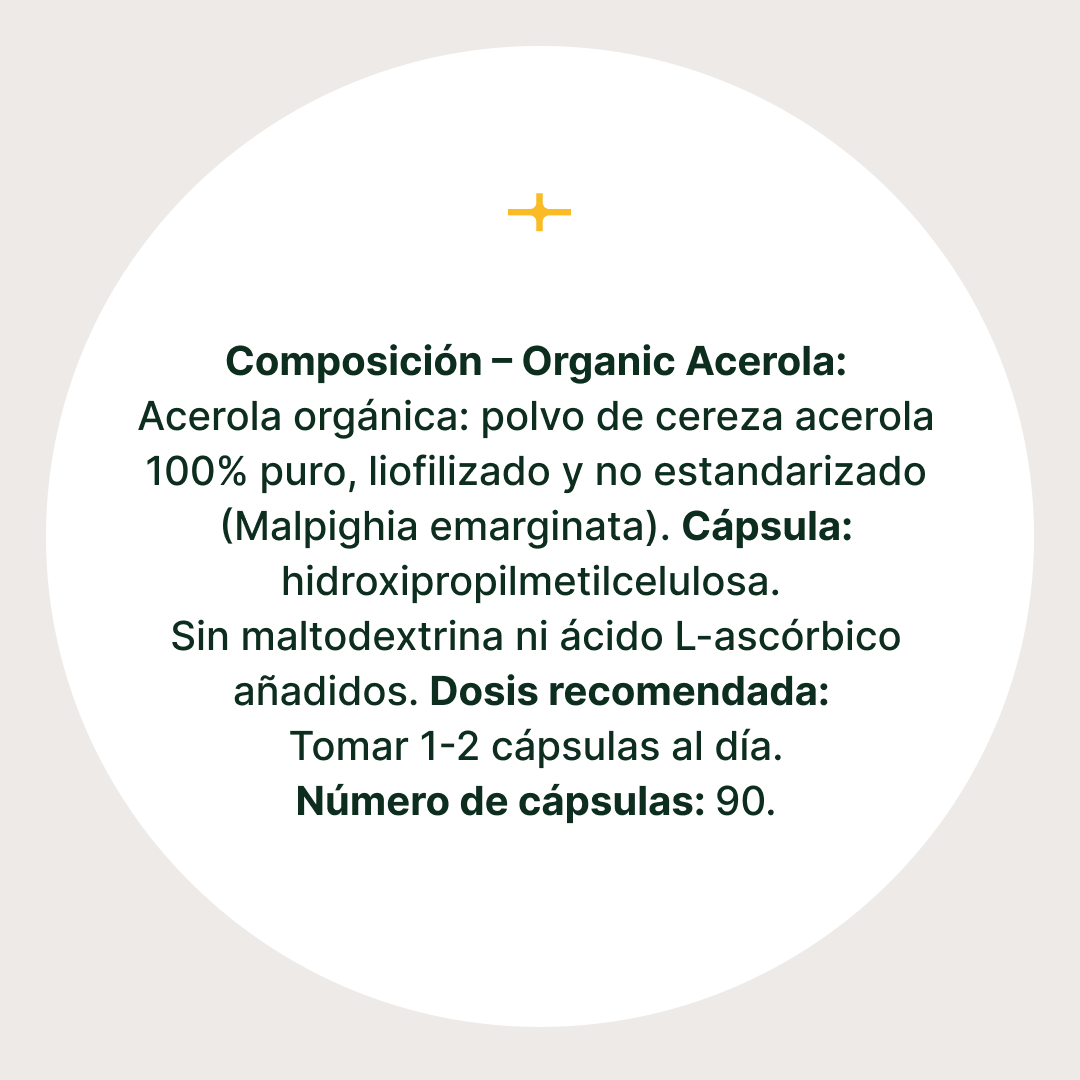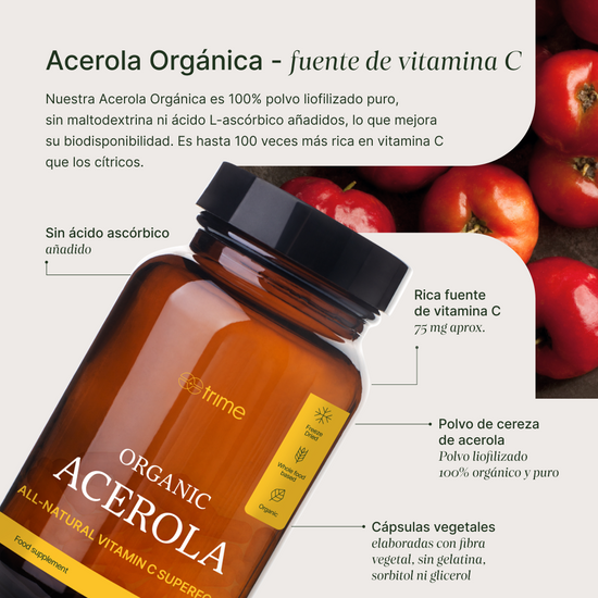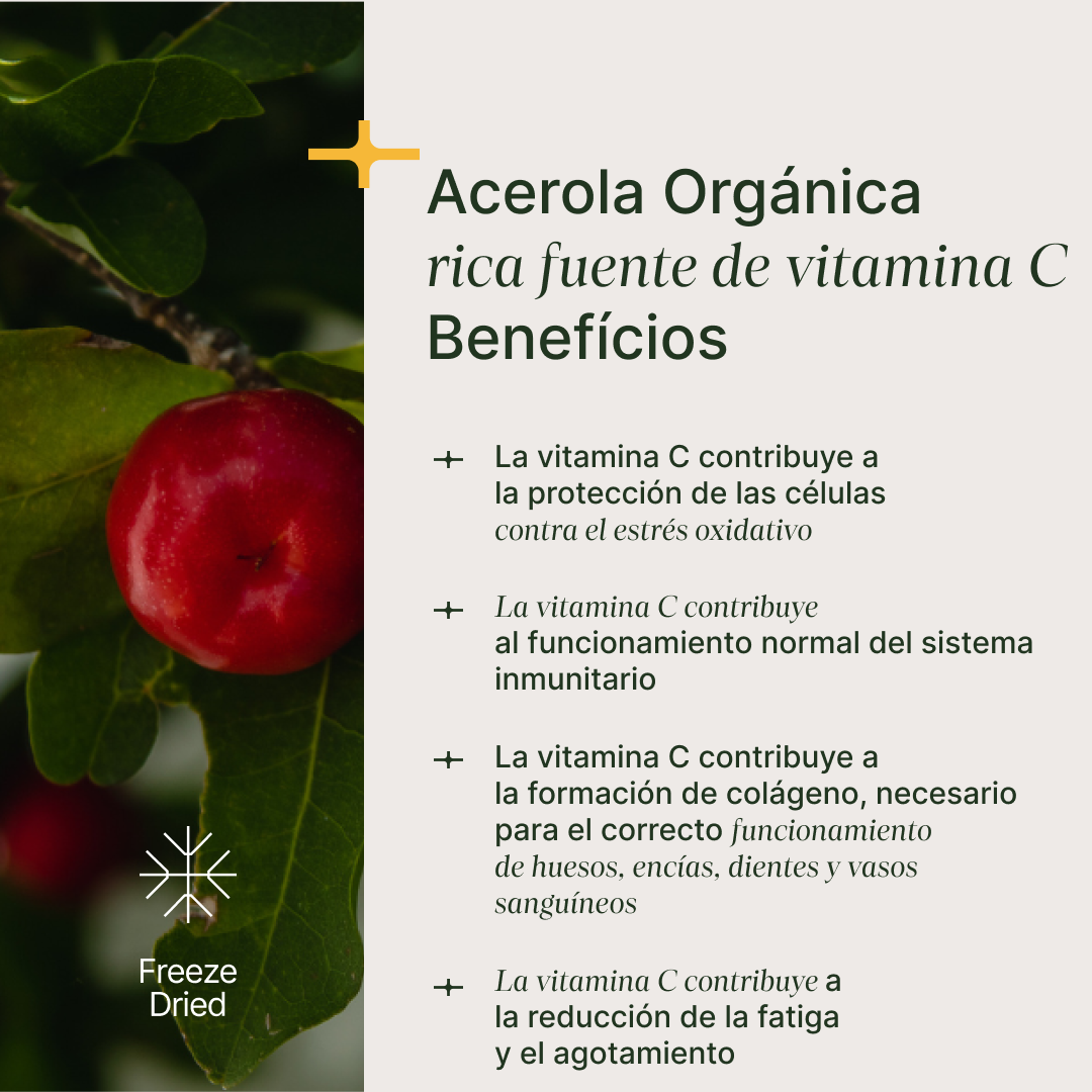 Nuestra acerola orgánica es polvo 100 % liofilizado sin aditivos (sin maltodextrina ni ácido L-ascórbico añadidos). Es una fuente de vitamina C hasta 100 veces más rica que las naranjas o los limones.