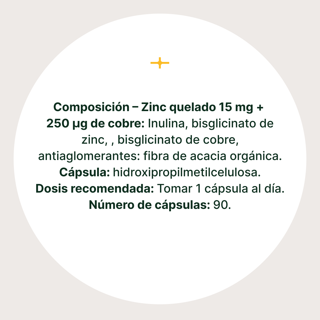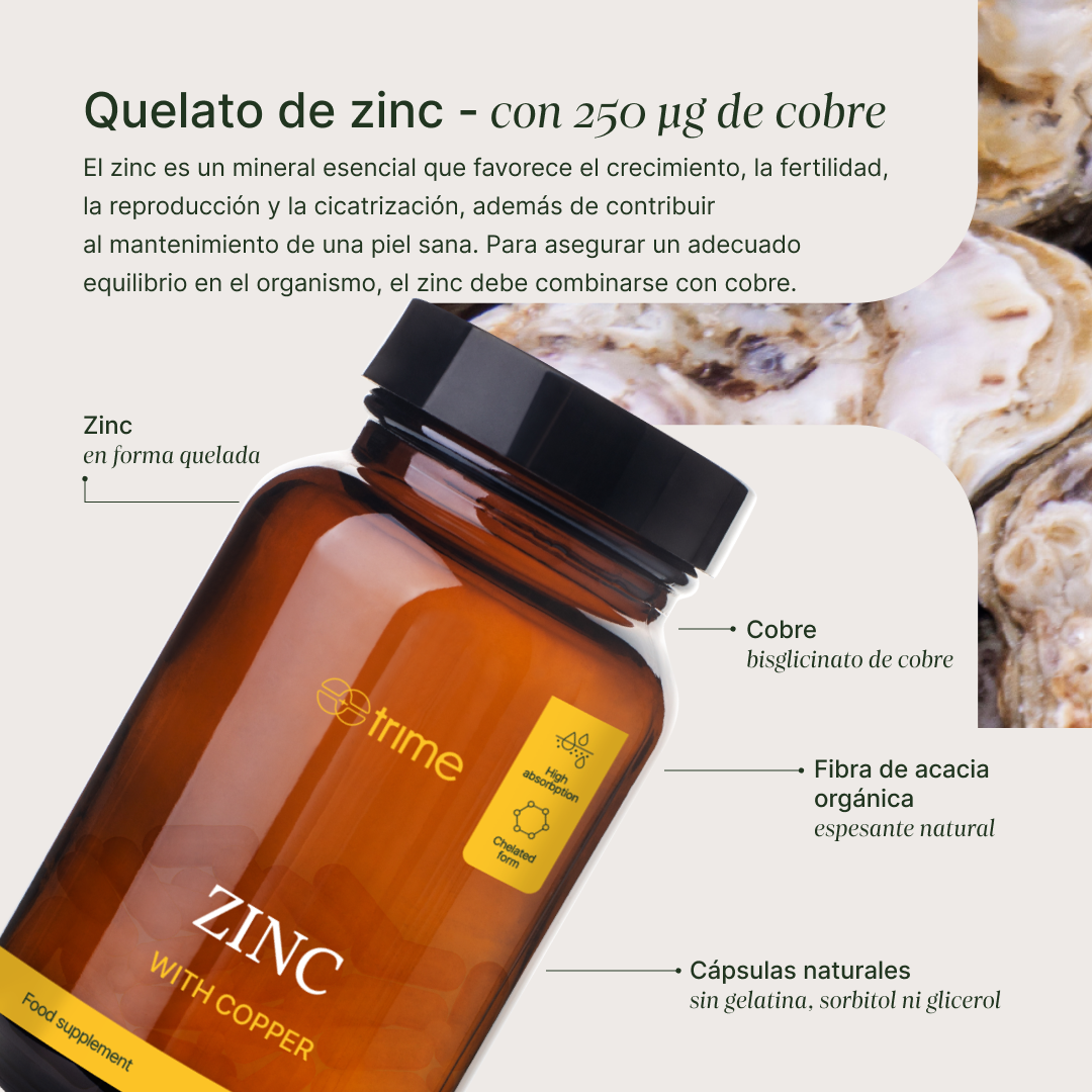 El quelato de zinc es la forma más fácilmente absorbible de este importante mineral, que no solo refuerza el sistema inmunitario, sino que también juega un papel clave en otras funciones corporales. Para mantener el equilibrio adecuado entre zinc y cobre, hemos combinado ambos elementos en este suplemento.